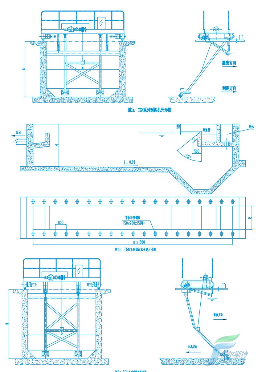 TGN系列刮泥機如圖1a、2a所示,由行車、刮泥耙、撇渣耙、驅動裝置和控制柜等組成。