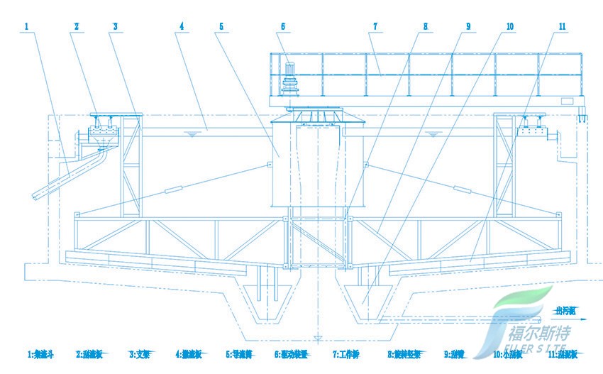 中心傳動垂架式刮泥機如圖1所示由集渣斗1、刮渣板2、支架3、撇渣板4、導流筒5、驅動裝置6、工作橋7、旋轉豎架8、刮臂9、小刮板10、刮泥板11等組成。