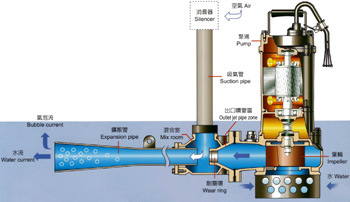 - 一、潛水射流曝氣機(jī)結(jié)構(gòu)簡介及工作原理: 深水自吸式潛水射流曝氣機(jī)主要由WQ型潛水排污泵、文丘里管、擴(kuò)散管、進(jìn)氣管及消音qi等組成。通過潛水泵產(chǎn)生的水流經(jīng)過噴嘴形成高速水流,在噴嘴周圍形成負(fù)壓吸入空氣,經(jīng)混合室與水流混合,在喇叭形的擴(kuò)散管內(nèi)產(chǎn)生水氣混合流,高速噴射而出,夾帶許多氣泡的水流在較大面積和深度的水域內(nèi)